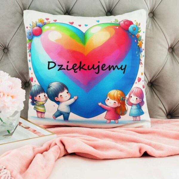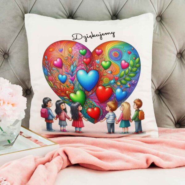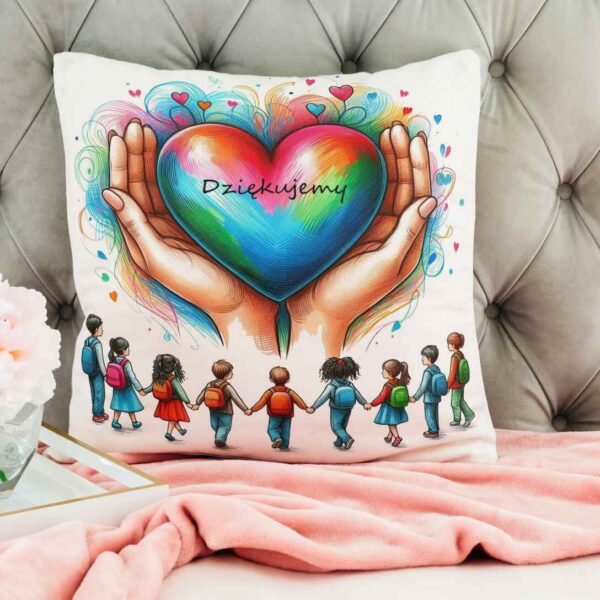 Poduszka na Dzień Nauczyciela serca, uczniowie trzymają się za ręce, napis „Dziękujemy”