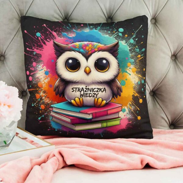 Poduszka na Dzień Nauczyciela sowa, książki, napis „Strażniczka Wiedzy”