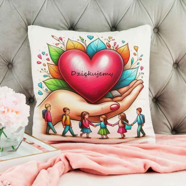 Poduszka na Dzień Nauczyciela serce na dłoni, uczniowie, napis „Dziękujemy”