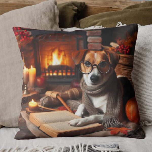 Poduszka czytający książkę Chihuahua w okularach w fotelu przy kominku
