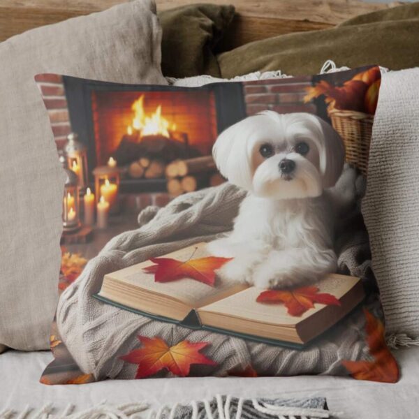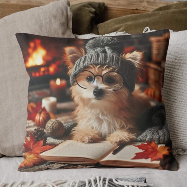 Poduszka pies Owczarek z książką przy kominku w okularach