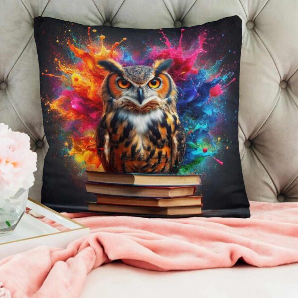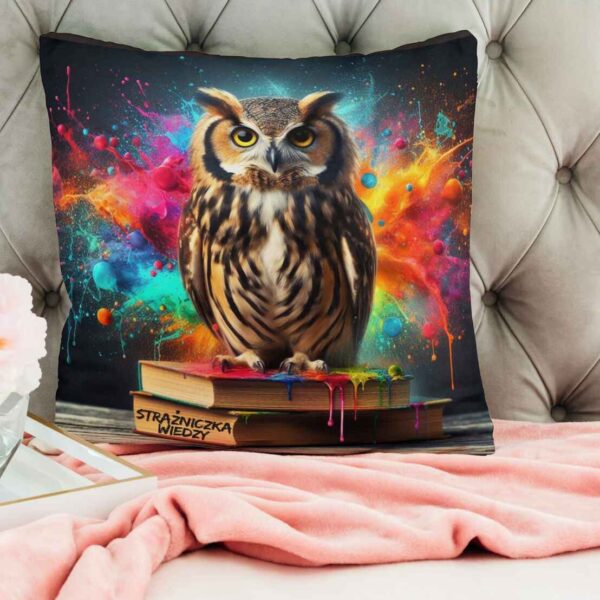 Poduszka na Dzień Nauczyciela, sowa z książkami na kolorowym tle