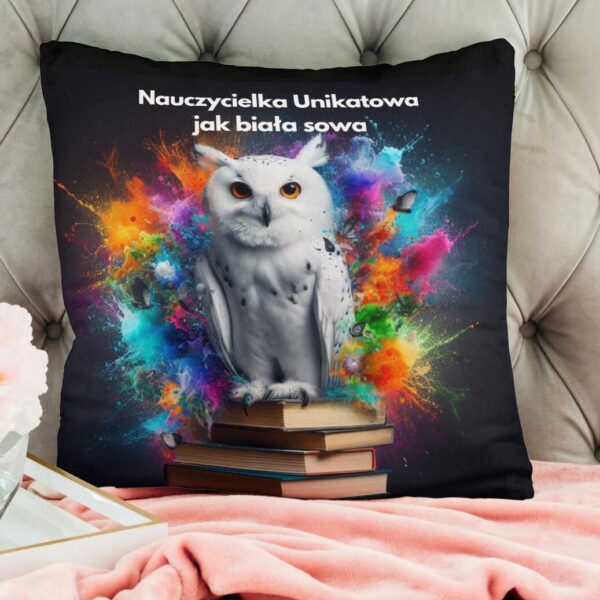 Poduszka na Dzień Nauczyciela, sowa z książkami na kolorowym tle, napis „Nauczycielka unikatowa jak biała sowa””