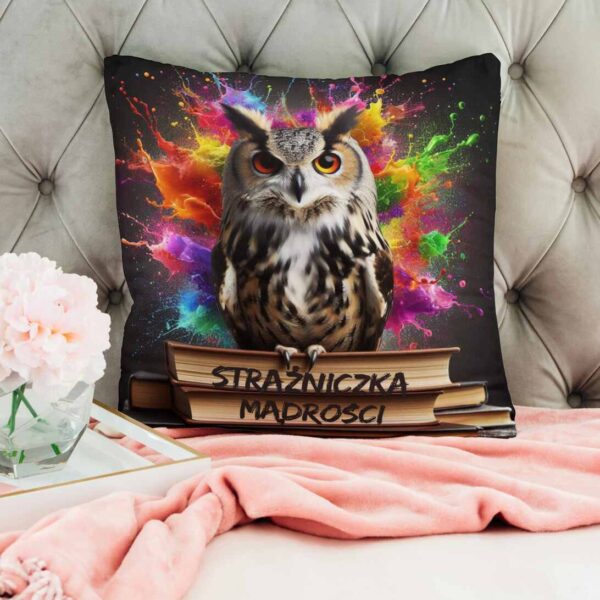 Poduszka na Dzień Nauczyciela, sowa i książki, napis „Strażniczka wiedzy”